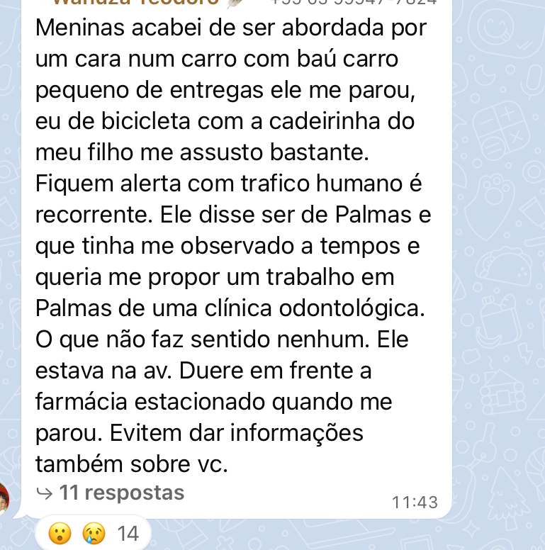 De acordo com os relatos, o suspeito estaria circulando em baixa velocidade, observando as vítimas e iniciando conversas com abordagens consideradas estranhas. Em um dos casos, a mãe contou que estava de bicicleta com o filho quando foi parada pelo homem, que alegou oferecer uma oportunidade de trabalho em Palmas. A justificativa, no entanto, levantou desconfiança.